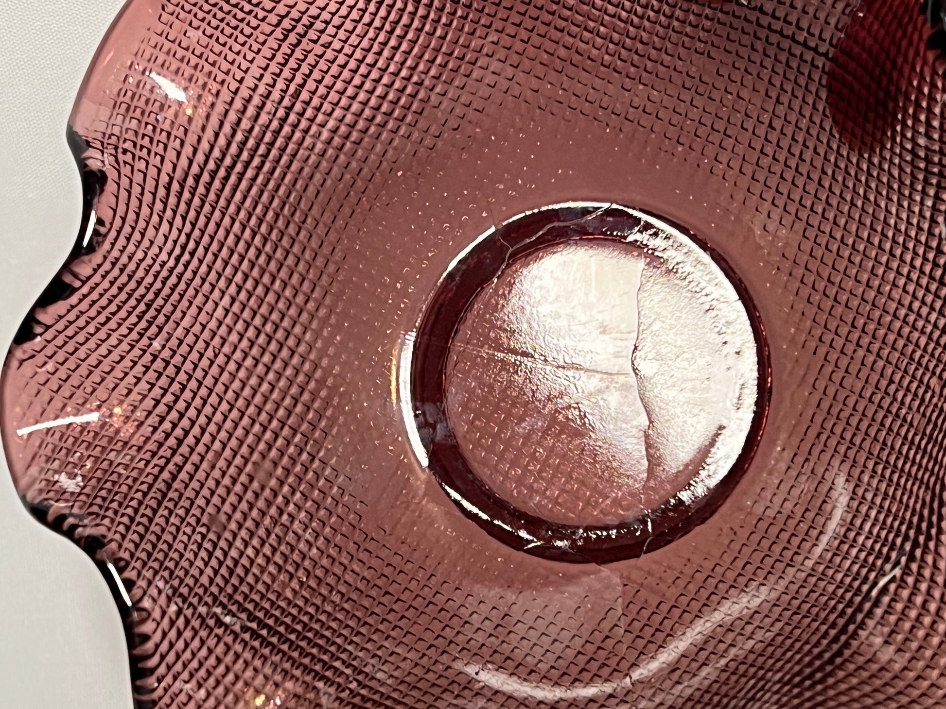 Amethyst Waffle Glass Bowl w/ Ruffled Edge by Colony, appears to have some manufacturer/process imperfections/lines in the interior as shown but it does not detract from function or extend beyond the surface, approx 5 1/2" in diameter and 2 1/4" in height, stand not included